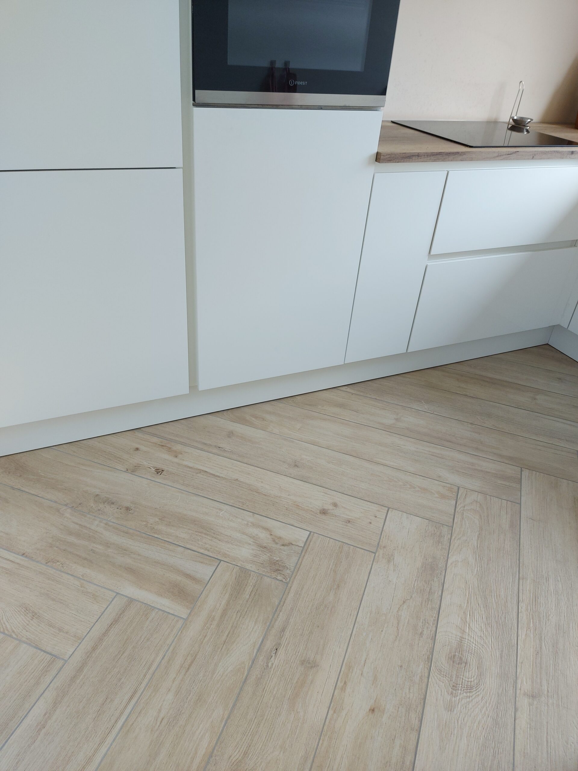 Hier hebben we tegels boven het aanrecht geplaatst. Uitwendige hoeken worden gemaakt volgens de “Jolly” methode. Tegels worden onder verstek